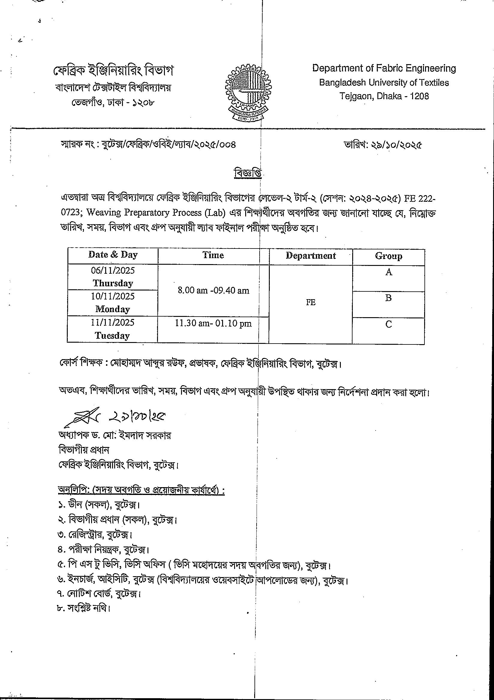 30 Oct 2025 Weaving Preparatory Process Lab Final Exam Schedule FE L2-T2 Academic Notices, Undergrade Admission News