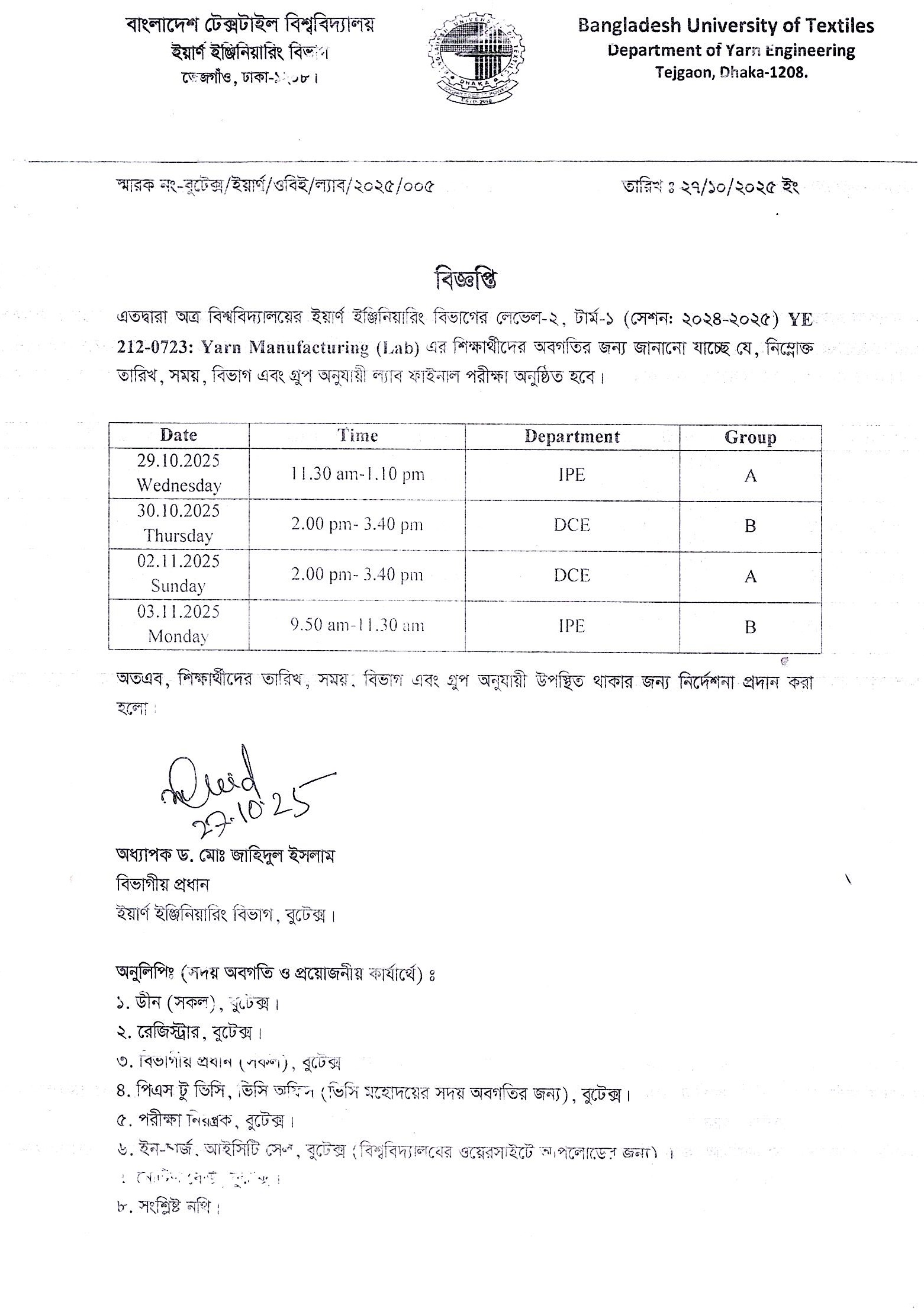 • Course Co-Ordinator Notice of Dyes and Chemical Engineering Dept. April 22, 2026